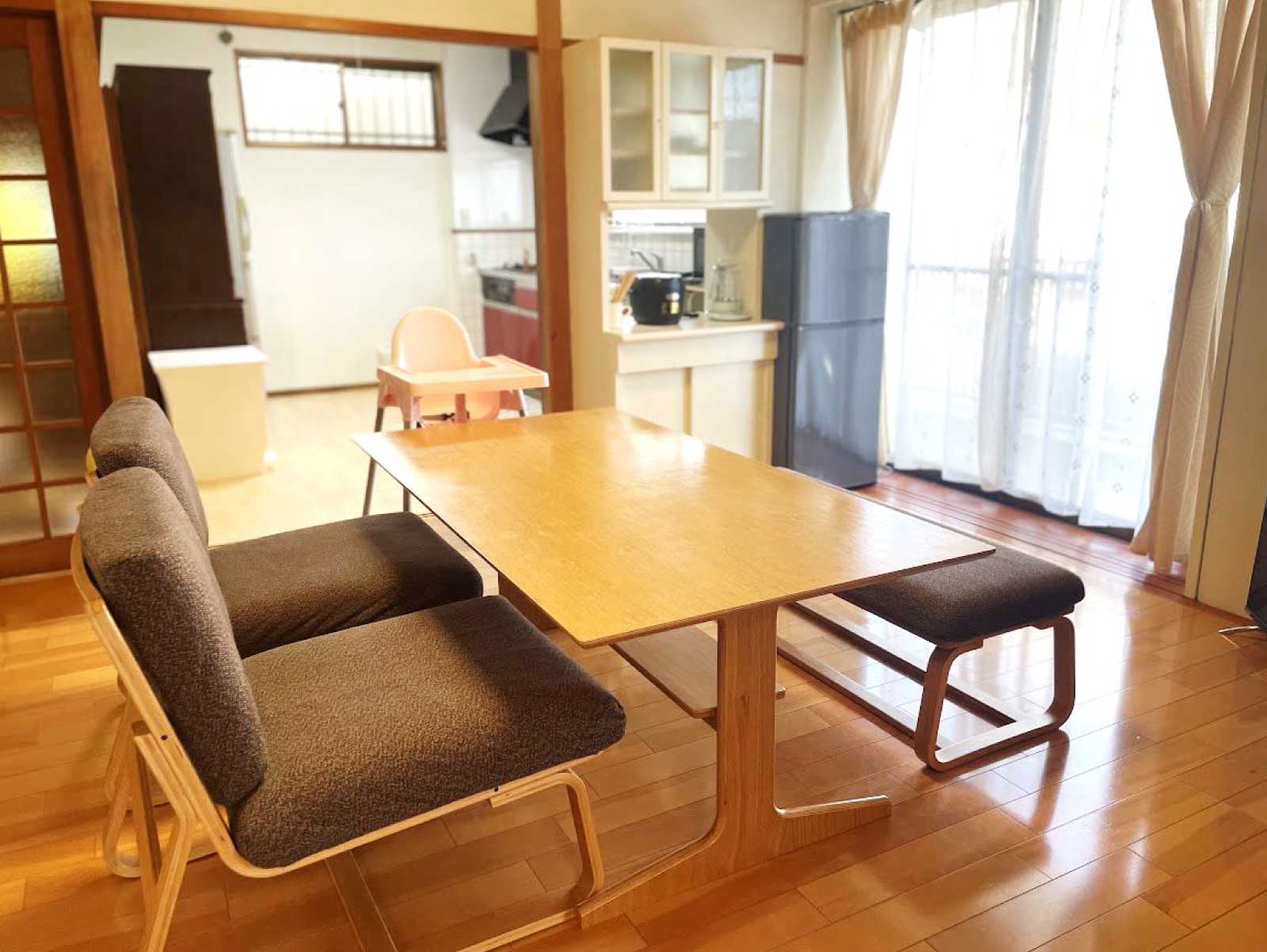 - 3LDKのアットホームな住居で、鍵付きの個室と、共用の広いキッチン、日当たりのよいリビング、バス・トイレが整備されています。